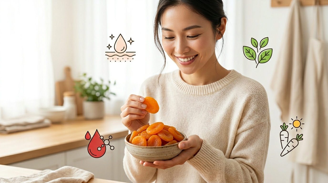 ドライアプリコット(あんず)は、βカロテン約3.2倍・鉄分約7.7倍・カリウム約6.5倍に凝縮された栄養価の高い食品。美肌・貧血・むくみ・免疫ケアすべてに効く、特に女性におすすめのドライフルーツです。
